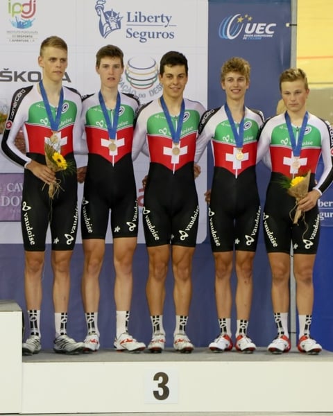 Erfolgreiche Schweizer Bahnfahrer an der Bahn-Europameisterschaft in Portugal. Der U19-4er der Schweizer holt die Bronzemedaille! Mit dabei mit Gino Mäder auch ein Berner!
